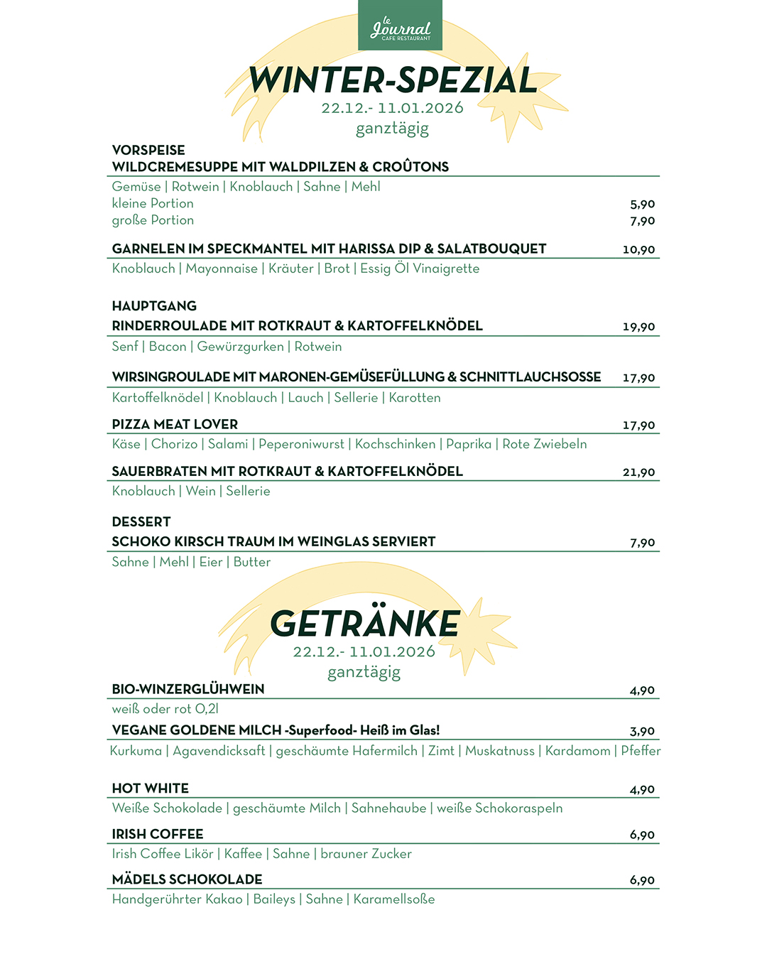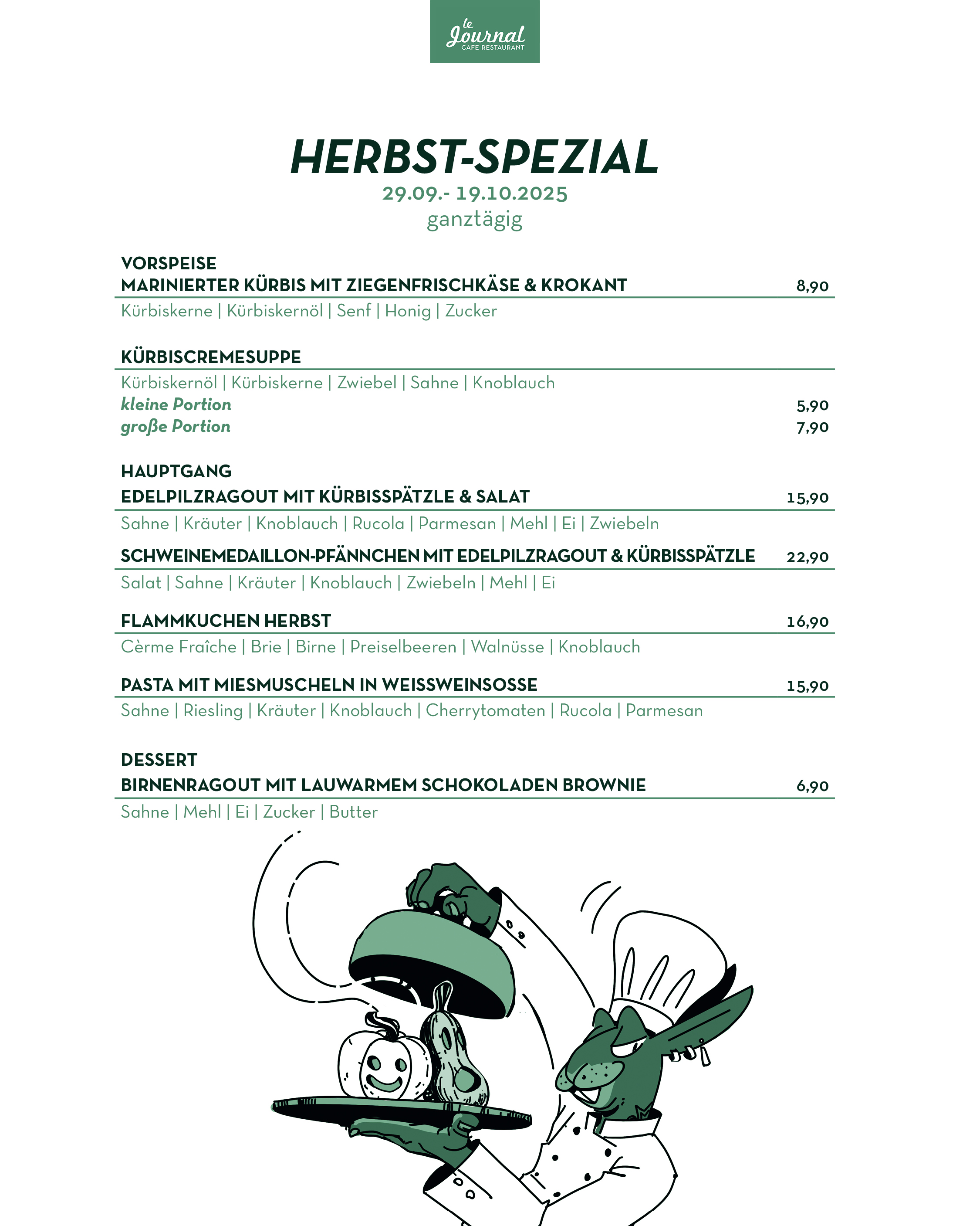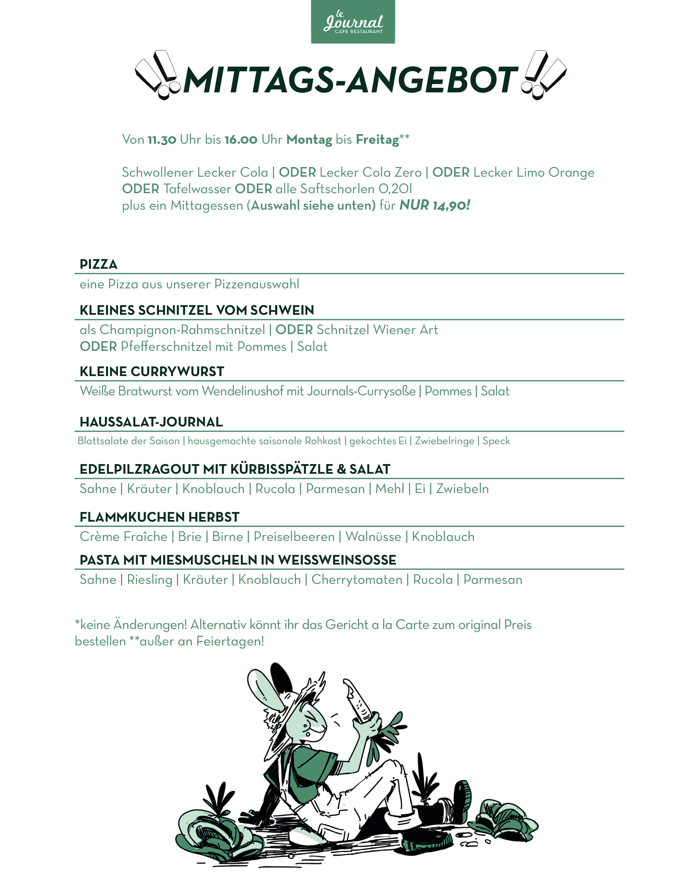 durchgehend warme Küche von 11.30 Uhr bis Open End (mind. bis 21.00 Uhr)